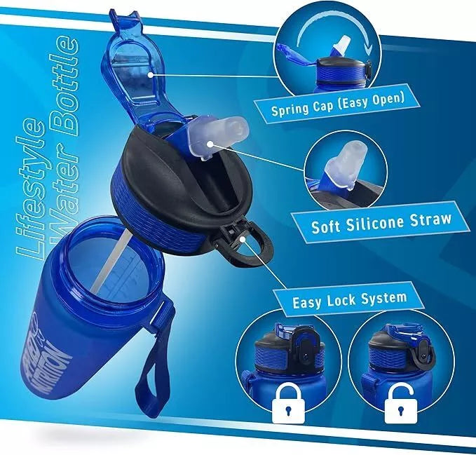 Mūsų „Applied Nutrition Lifestyle“ vandens buteliukas talpina iki 1 litro skysčių. Šis vandens buteliukas puikiai tinka pasiimti su savimi kelyje ir turi nešiojimo rankeną, todėl galite jį pasiimti bet kur, nesijaudindami dėl jo įsidedimo į krepšį. „Lifestyle“ gėrimų buteliukai turi silikoninį snapelį, kurį galima atlenkti, kai norite atsigerti. Baigę gerti, tiesiog jį nulenkite. Nulenkus snapelį, jis užsifiksuoja, todėl jums nereikia jaudintis dėl išsiliejusio skysčio krepšyje. „Lifestyle“ vandens buteliukas yra stilingo mėlyno dizaino ir puikiai tinka sporto salės entuziastams. Kadangi kiekviename buteliuke telpa iki 1 litro skysčių, galite lengvai sužinoti, kiek vandens išgėrėte treniruotės metu ar būdami lauke.