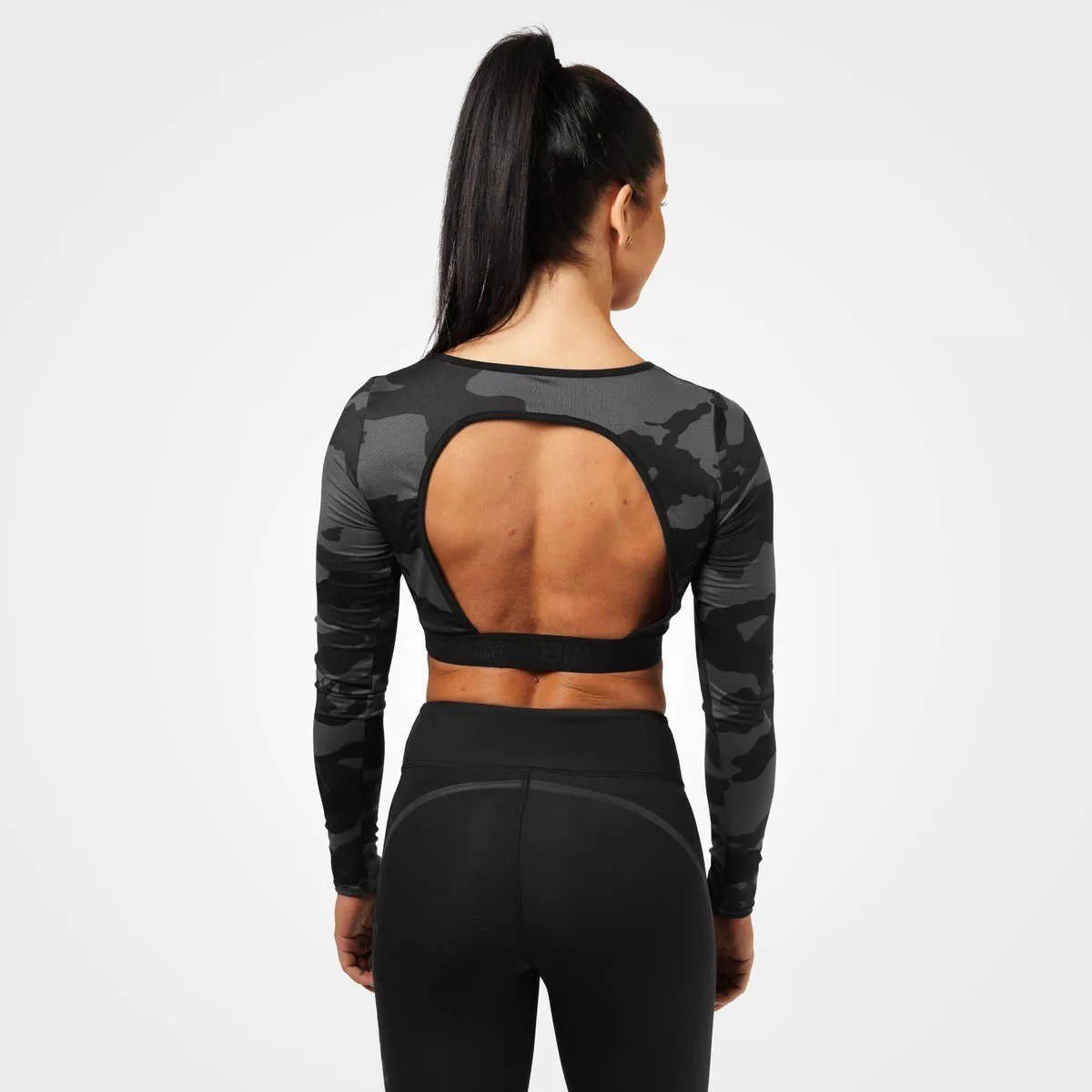 Better Bodies Chelsea cropped Is (dark camo) - labai patogi, elastinga moteriška palaidinė. Puikiai priglundanti prie kūno. Ilgomis rankovėmis bei atvira nugara. Būkite išskirtinė!