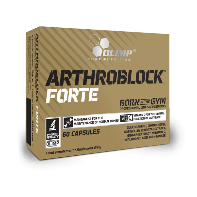 Arthroblock Forte - maisto papildas, kuriame yra imbiero ekstrakto, Boswellia serrata ekstrakto ir gliukozamino. Produkto sudėtyje taip pat yra vitamino C, kuris prisideda prie normalaus kolageno susidarymo normaliai kaulų ir kremzlių funkcijai, taip pat mangano, kuris padeda palaikyti normalius kaulus ir normalų jungiamojo audinio formavimąsi.